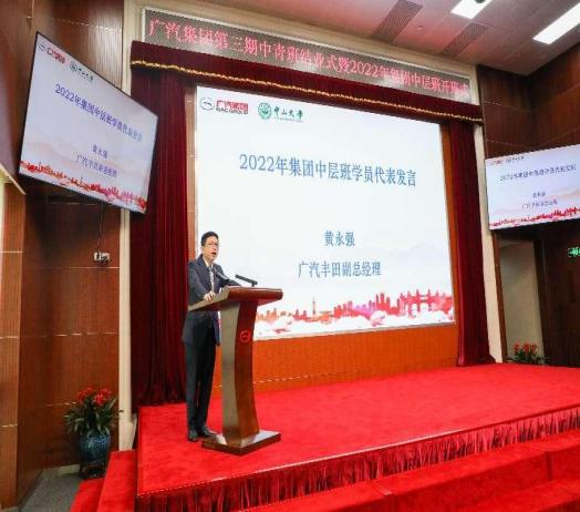 第三期中青年干部培训班学员代表卫海岗、中层主体班学员代表黄永强分别代表班级发言。广汽集团组织部长蔡杰介绍2022年集团中层主体班项目概况和实施计划。