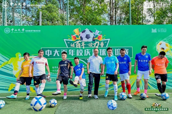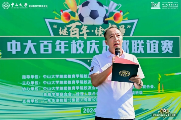 何晓钟院长致辞,对本次足球联谊赛的盛大举办致以祝贺,并表示足球这项运动,不仅能锻炼体魄,更能凝聚团队力量,希望校友们在比赛中充分展现中大人的团结协作精神,共同庆祝中大百年华诞。