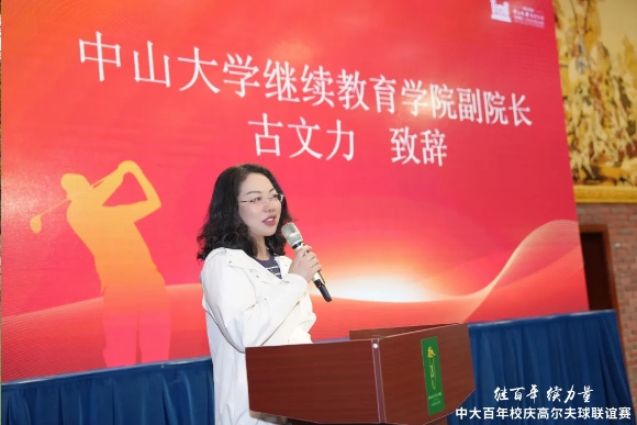 晚会古文力副院长致辞,对本次赛事的盛大举办致以祝贺,希望校友们共同努力,把今天球赛中凝聚的精神力量,如同高尔夫球般,穿越时空,永恒传承,共同书写着中大的新篇章。